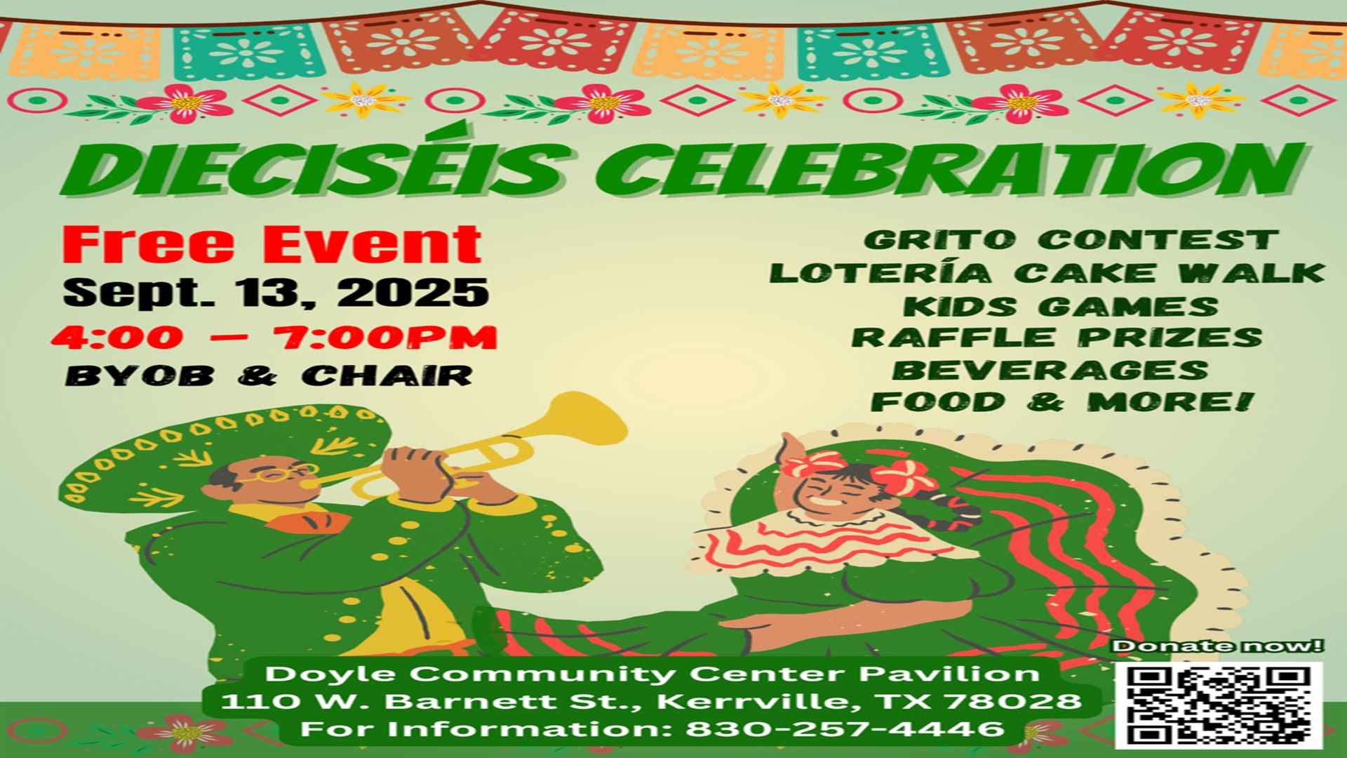 Sep 13 Dieciseis Celebration at Doyle Community Center 3:00 pm - 6:00 pm Doyle Community Center 110 West Barnett Street, Kerrville Event Details Get Directions